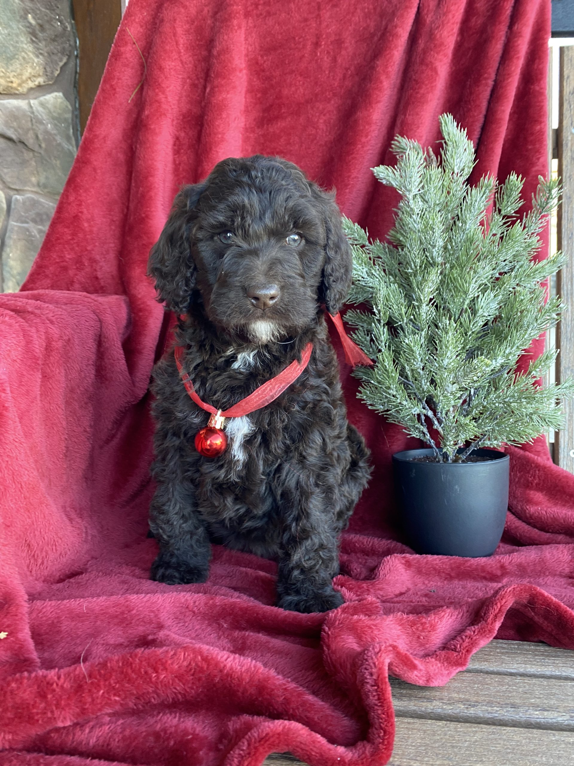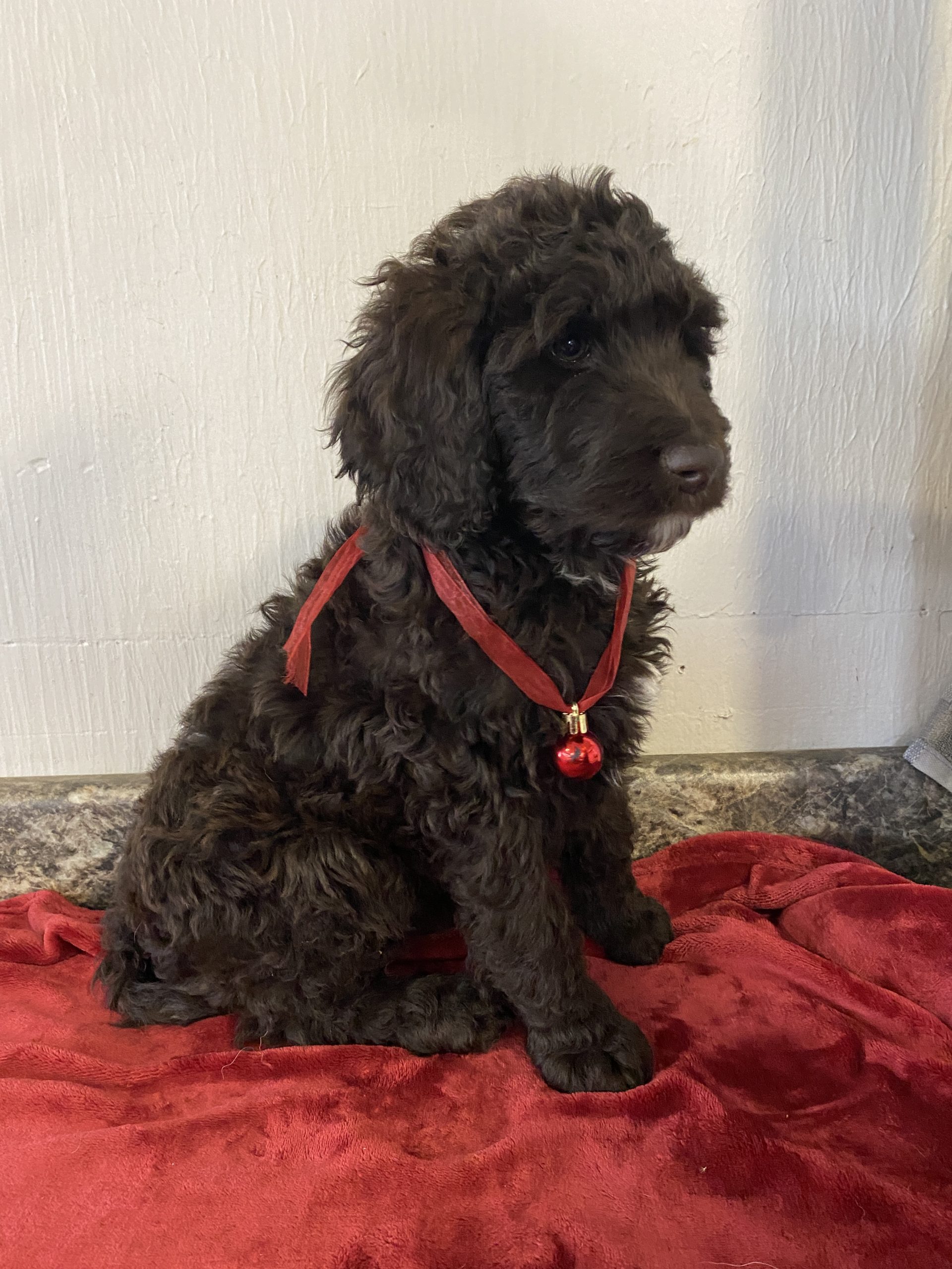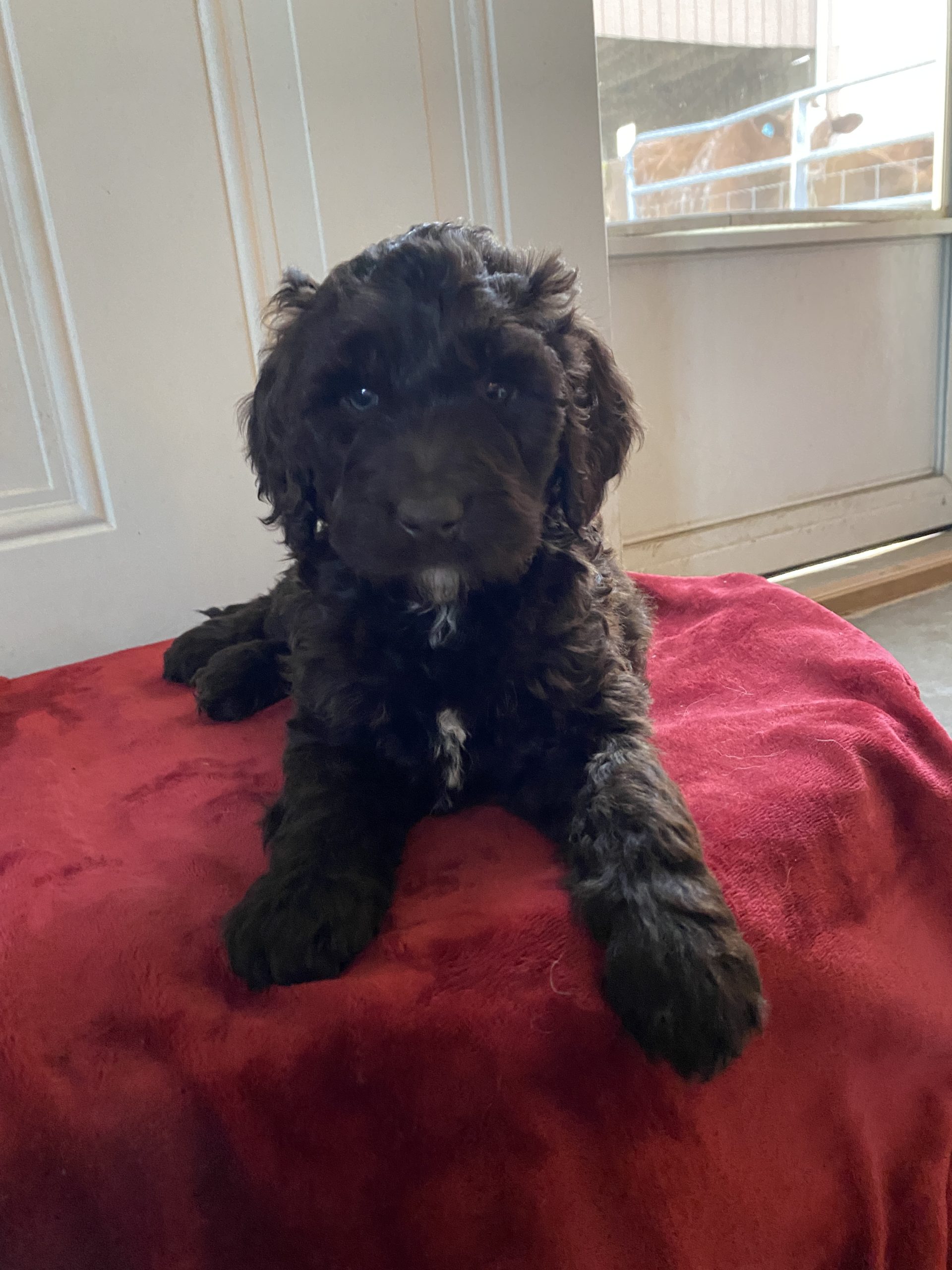 Meet Cookie, an adorable chocolate labradoodle with a white chin and white stripe on her neck/chest area. Super soft curly chocolate coat!