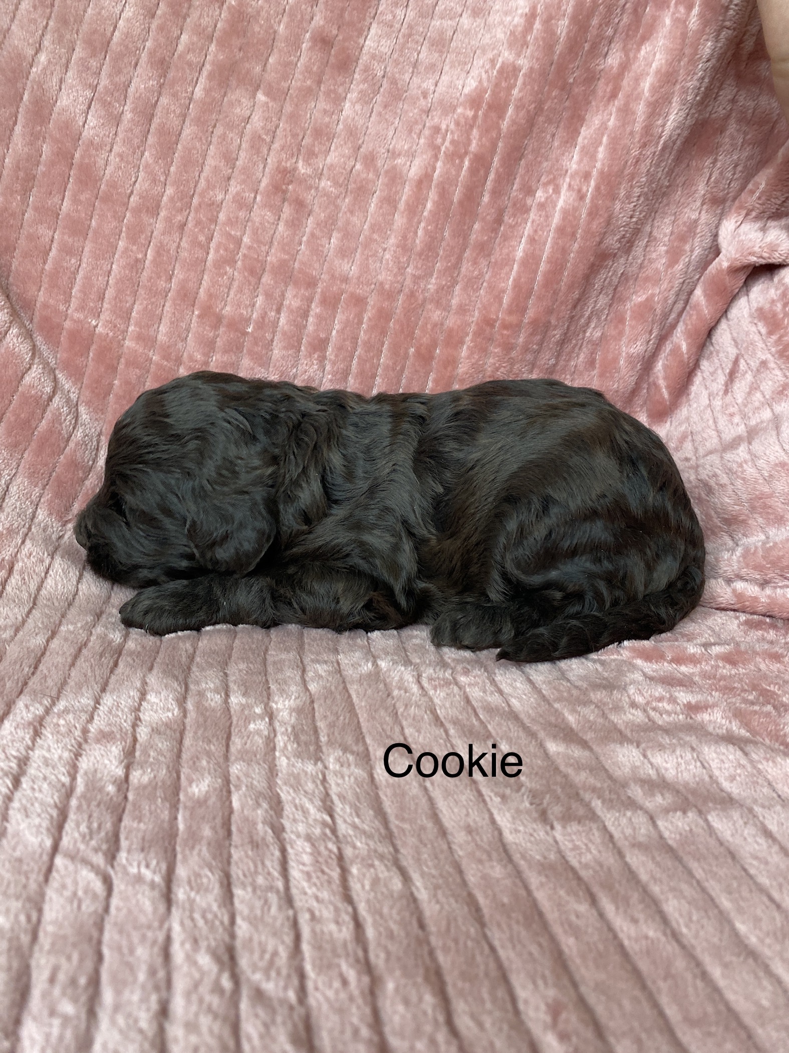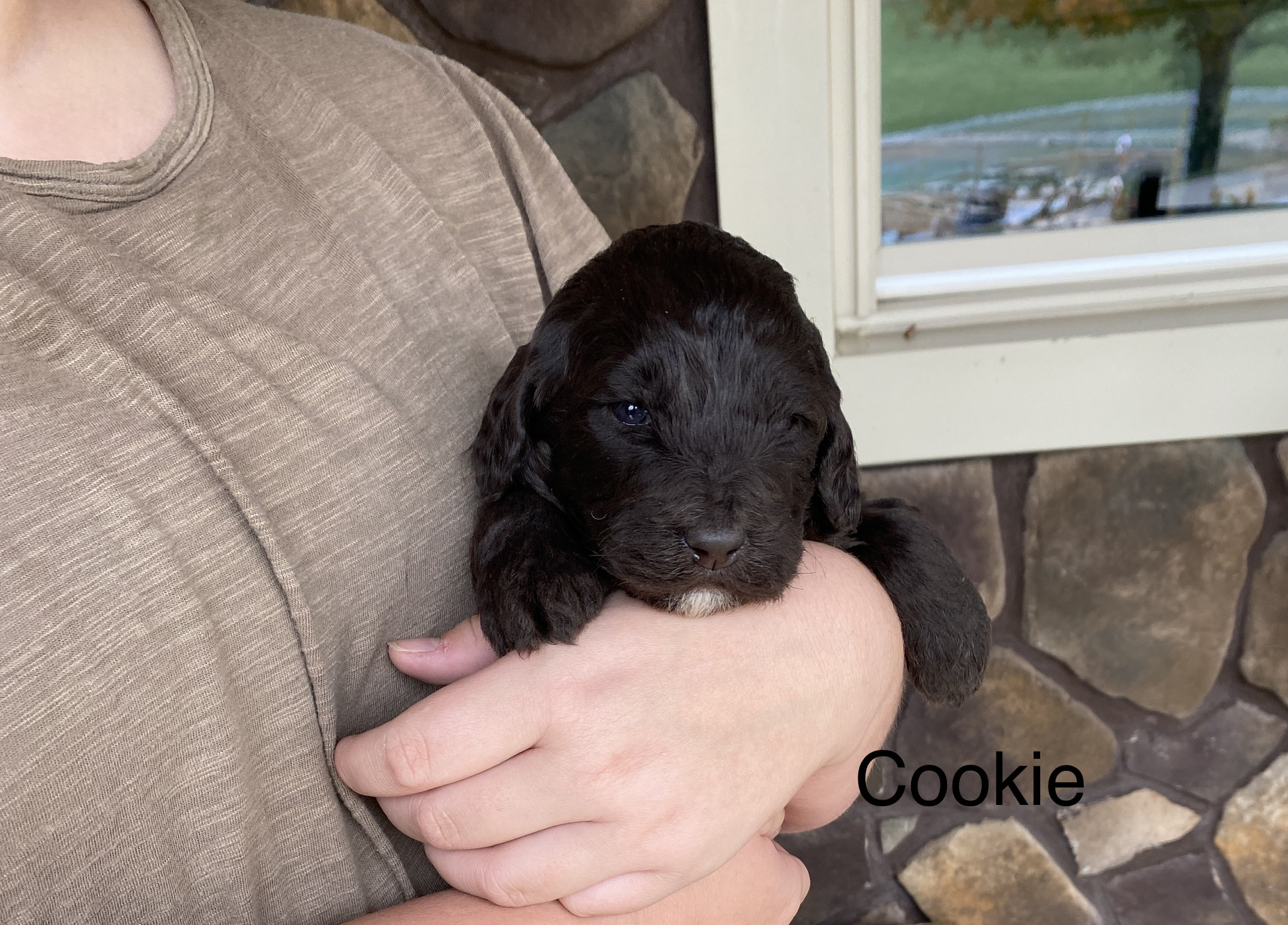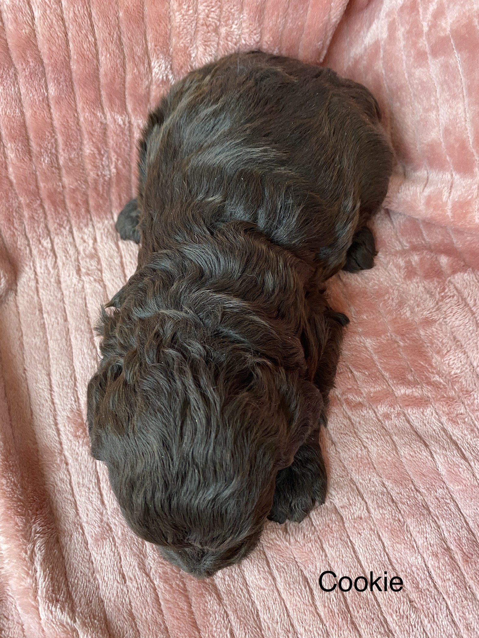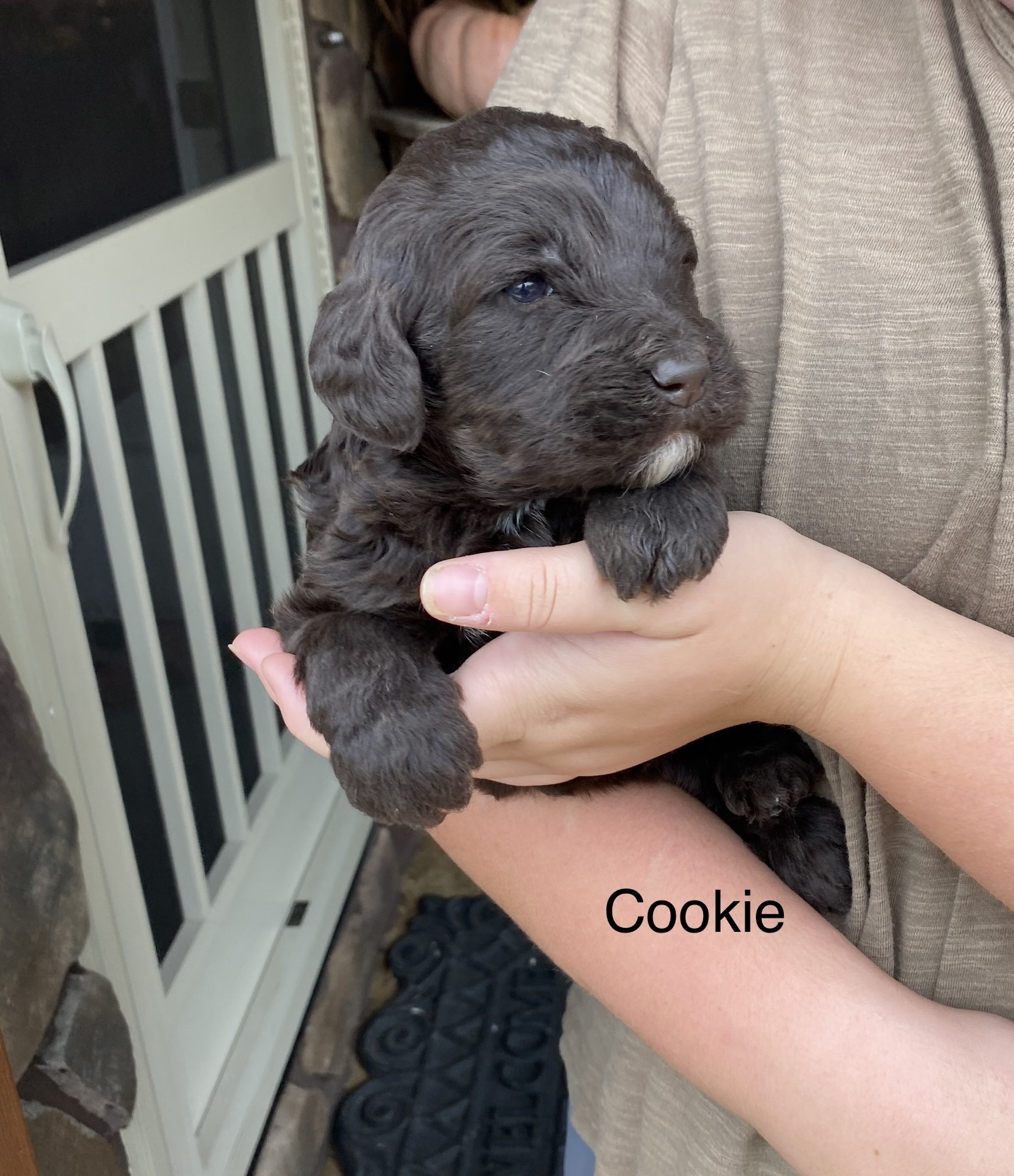 Meet Cookie, an adorable chocolate labradoodle with a white chin and white stripe on her neck/chest area. Super cute wavy coat!