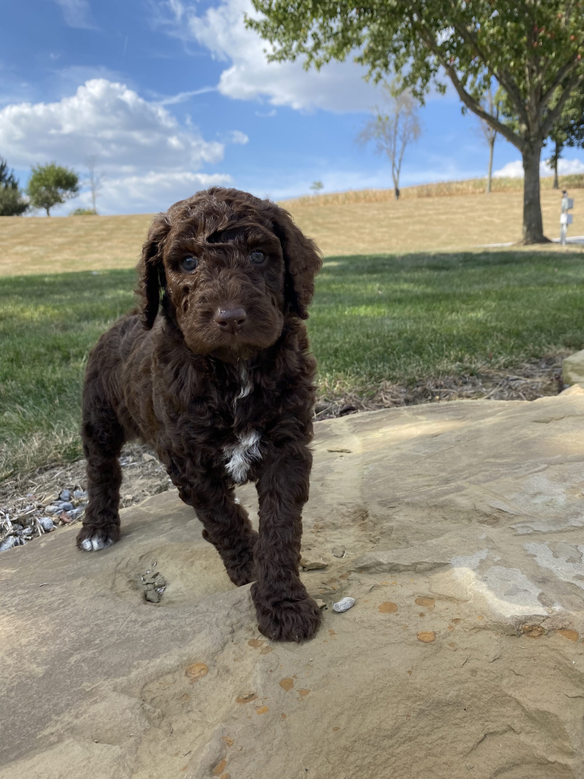 She has a soft curly coat with some white markings on her chest and paws. A sweet girl to add to your family. 🐾 Daisy has a fun playful temperment just like her mom.